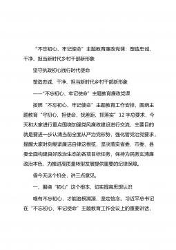 “不忘初心、牢记使命”主题教育廉政党课:塑造忠诚、干净、担当新时代乡村干部新形象坚守执政初心践行时代使命塑造忠诚、干净、担当新时代乡村干部新形象——“不忘初心、牢记使命”主题教育廉政党课按照“不忘初心、牢记使命”主题教育工作安排,围绕主题教育“守初心、担使命,找差距、抓落实”12字总要求,今天和大家进行重点围绕加强党风廉政建设进行交流,主要目的就是要进一步认清当前全面从严治党形势,强化管党治党要求,提醒大家时刻绷紧廉洁自律这根弦,坚决落实省委、市委、县委全面构建良好政治生态的各项目标任务,保持为民务实清廉政治本色,为推进高质量转型发展提供重要的纪律保障。借今天这个机会,讲三点意见。一、围绕“初...
