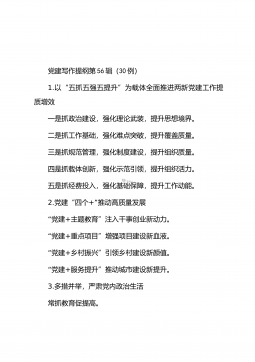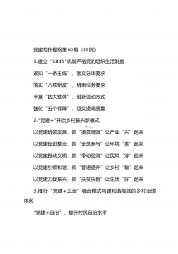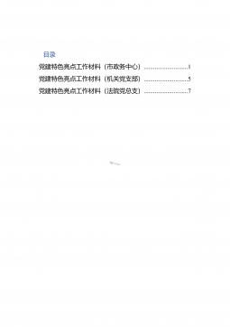 目录党建特色亮点工作材料(市政务中心)............................1党建特色亮点工作材料(机关党支部)............................5党建特色亮点工作材料(法院党总支)............................7党建特色亮点工作材料(市政务中心)一、党支部建在窗口,党员示范在窗口市政务中心是个“小联合国”,目前共进驻32个市直单位,窗口工作人员120多人,其中党员54人,建有3个窗口党支部,由3名窗口首席代表分别担任党支部书记。今年,机关党委提出了“党支部建在窗口,党员示范在窗口”的工作理念,开展“亮身份、亮标准、亮承诺;比...
