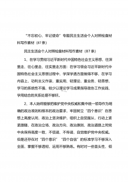 “不忘初心、牢记使命”专题民主生活会个人对照检查材料写作素材(87条)民主生活会个人对照检查材料写作素材(87条)1、在学习贯彻习近平新时代中国特色社会主义思想,往深里走、往心里走、往实里走方面:在学习领会习近平新时代中国特色社会主义思想过程中,学深学透方面做得不够,在学习内容上,功利主义作祟,重实用、轻理论,重业务、轻思想,学习的系统性不强,较少以理论学习成果指导政协工作实践,学用结合的关系处理不够好。2、本人始终能够把维护党中央权威和集中统一领导作为明确的政治准则和根本的政治要求,牢固树立“四个意识”在思想上高度认同,政治上坚决维护,组织上自觉服从,行动上紧紧跟随,在政治立场、政治方向、政...
