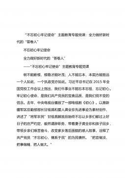 “不忘初心牢记使命”主题教育专题党课:全力做好新时代的“答卷人”不忘初心牢记使命全力做好新时代的“答卷人”——“不忘初心牢记使命”主题教育专题党课树不能断根,根稳才能叶茂;人不能忘本,本固方能致远一个人如此,一个执政党亦如此。习近平总书记在2015年全国党校工作会议上指出,我们干事业不能忘本忘祖、忘记初心。牢记初心使命,是我们共产党员的宝贵品质,是我们党不变的信念。去年,中央电视台播放了一部电视剧《初心》。以原新疆军区后勤部部长甘祖昌和爱人龚全珍先进事迹为素材创作,讲述了“将军农民”甘祖昌解放后始终不忘让乡亲们都过上好日子的庄严约定,毅然请辞职务,带着妻子龚全珍和孩子回乡,带领乡亲们艰苦奋斗,...