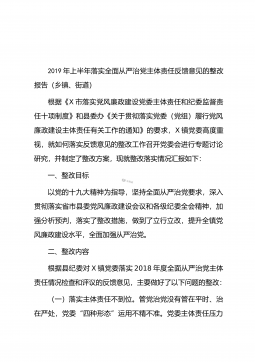 2019年上半年落实全面从严治党主体责任反馈意见的整改报告(乡镇、街道)根据《X市落实党风廉政建设党委主体责任和纪委监督责任十项制度》和县委办《关于贯彻落实党委(党组)履行党风廉政建设主体责任有关工作的通知》的要求,X镇党委高度重视,就如何落实反馈意见的整改工作召开党委会进行专题讨论研究,并制定了整改方案,现就整改落实情况汇报如下:一、整改目标以党的十九大精神为指导,坚持全面从严治党要求,深入贯彻落实省市县委党风廉政建设会议和各级纪委全会精神,加强分析预判,落实了整改措施,做到了立行立改,提升全镇党风廉政建设水平,全面加强从严治党。二、整改内容根据县纪委对X镇党委落实2018年度全面从严治党主...