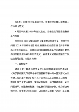 X局关于开展2019年形式主义、官僚主义问题自查整改工作方案(范文)X局关于开展2019年形式主义、官僚主义问题自查整改工作方案按照中共XXX纪委印发的《集中整治形式主义、官僚主义问题2019年行动举措》和纪委驻局纪检监察组《关于开展2019年形式主义、官僚主义问题自查整改工作的通知》要求,局机关将开展2019年形式主义、官僚主义问题自查整改工作,结合我局实际,制定本方案:一、目标任务对照《关于解决形式主义突出问题为基层减负的通知》《关于贯彻落实习近平总书记重要指示精神集中整治形式主义、官僚主义的工作意见》和《关于防治形式主义官僚主义的若干措施》等三个文件要求,坚持问题导向,通过自查自纠、列出...