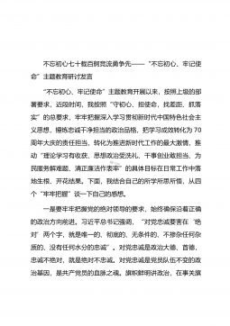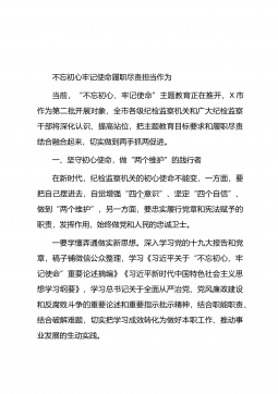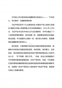 不忘初心牢记使命做忠诚履职律己的党办人——“不忘初心、牢记使命”主题教育演讲稿习近平同志在作十九大报告时说,中国共产党人的初心和使命,就是为中国人民谋幸福,为中华民族谋复兴。2014年5月8日,习近平总书记在中央办公厅走访调研时,对中办提出了5个坚持的希望和要求,其中的第一条,就是要坚持绝对忠诚的政治品格。作为县委办公室的一员,践行初心和使命,就是要做忠诚履职律己的党办人。党办姓党,它是保障中央和地方党委决策落实的前哨,是服务中央和地方党委运转的后院,地位特殊,责任重大。正因如此,党办的阵地必须始终由忠诚于党和党的事业的人来坚守。古人云:“天下至德,莫大于忠。”忠诚,自古以来就是我们中华民族所...