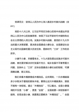 党课范文:坚持以人民为中心深入推进乡村振兴战略(含PPT)党的十八大以来,以习近平同志为核心的党中央提出并坚持以人民为中心的发展思想,体现了习近平新时代中国特色社会主义思想的人民立场。实施乡村振兴战略,是党的十九大作出的重大决策部署,是决胜全面建成小康社会、全面建设社会主义现代化国家的重大历史任务,是新时代“三农”工作的总抓手。小康不小康,关键看老乡。十九大报告提出实施乡村振兴战略,意在更好解决农村发展不充分、城乡发展不平衡等重大问题,加快补上“三农”这块全面建成小康社会的短板,可谓高瞻远瞩,意义深远。我们来看木桶原理或木桶效应。众所周知,一只水桶能装多少水取决于最短的那块木板。要想让这只木桶...