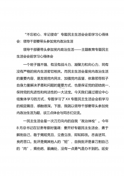 “不忘初心、牢记使命”专题民主生活会会前学习心得体会:领导干部要带头参加党内政治生活领导干部要带头参加党内政治生活——主题教育专题民主生活会会前学习心得体会一个班子强不强、有没有战斗力、凝聚力和向心力,同有没有严格的党内生活密切相关。而民主生活会是党内政治生活的重要内容,是发扬党内民主、加强党内监督、依靠领导班子自身力量解决矛盾和问题的重要方式,也是保证党的团结统一、保持党的先进性和纯洁性的一大法宝。今天我们通过理论中心组集体学习的方式,专题学习了XX专题民主生活会会前学习的规定篇目,感触很深。下面,我就以领导干部要带头参加党内政治生活为题,谈三点体会与同志们交流。一民主生活会是一次刀刃向内的...