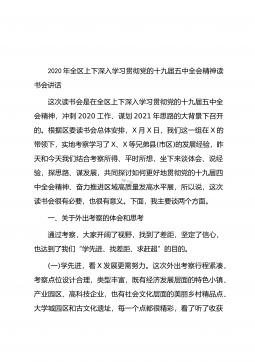 2020年全区上下深入学习贯彻党的十九届五中全会精神读书会讲话这次读书会是在全区上下深入学习贯彻党的十九届五中全会精神,冲刺2020工作、谋划2021年思路的大背景下召开的。根据区委读书会总体安排,X月X日,我们这一组在X的带领下,实地考察学习了X、X等兄弟县(市区)的发展经验,昨天和今天我们结合考察所得、平时所想,坐下来谈体会、说经验,探思路、谋发展,共同探讨如何更好地贯彻党的十九届四中全会精神、奋力推进区域高质量发高水平展,所以说,这次读书会很有必要,也很有意义。下面,我主要谈两个方面。一、关于外出考察的体会和思考通过考察,大家开阔了视野,找到了差距,坚定了信心,也达到了我们“学先进、找差...