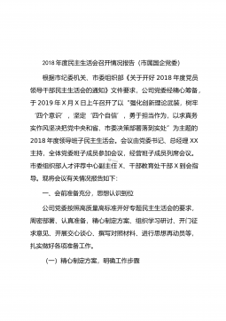 2018年度民主生活会召开情况报告(市属国企党委)根据市纪委机关、市委组织部《关于开好2018年度党员领导干部民主生活会的通知》文件要求,公司党委经精心筹备,于2019年X月X日上午召开了以“强化创新理论武装,树牢‘四个意识’,坚定‘四个自信’,勇于担当作为,以求真务实作风坚决把党中央和省、市委决策部署落到实处”为主题的2018年度领导班子民主生活会。会议由党委书记、总经理XX主持,全体党委班子成员参加会议,经营班子成员列席会议。市委组织部人才评荐中心副主任X、干部教育处干部X到会指导。现将会议有关情况报告如下:一、会前准备充分,思想认识到位公司党委按照高质量高标准开好专题民主生活会的要求,周...