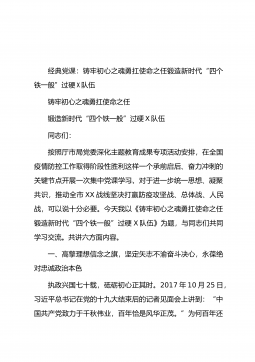 经典党课:铸牢初心之魂勇扛使命之任锻造新时代“四个铁一般”过硬X队伍铸牢初心之魂勇扛使命之任锻造新时代“四个铁一般”过硬X队伍同志们:按照厅市局党委深化主题教育成果专项活动安排,在全国疫情防控工作取得阶段性胜利这样一个承前启后、奋力冲刺的关键节点开展一次集中党课学习,对于进一步统一思想、凝聚共识,推动全市XX战线坚决打赢防疫攻坚战、总体战、人民战,可以说十分必要。今天我以《铸牢初心之魂勇扛使命之任锻造新时代“四个铁一般”过硬X队伍》为题,与同志们共同学习交流。共讲六方面内容。一、高擎理想信念之旗,坚定矢志不渝奋斗决心,永葆绝对忠诚政治本色执政兴国七十载,砥砺初心正其时。2017年10月25日,...