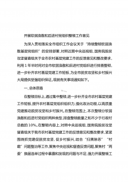 开展软弱涣散和后进村党组织整顿工作意见为深入贯彻落实全市组织工作会议关于“持续整顿软弱涣散基层党组织”的安排部署,对照近期中央巡视组、国务院脱贫攻坚督查组关于全市农村基层党建工作的反馈意见和整改要求,利用1年半时间对全市软弱涣散和后进村党组织进行排查整顿,进一步补齐农村基层党建工作短板,为全市脱贫攻坚和乡村振兴大局提供坚强组织保证。现就有关事项通知如下。一、总体思路在整顿目标上,通过集中整顿,进一步补齐全市农村基层党建工作短板,提升农村基层党组织组织力,强化政治功能,以高质量党建推动脱贫攻坚和乡村振兴。在整顿范围上,本次整顿分软弱涣散和后进村党组织两种类型,排查整顿数量之和不少于行政村总数的1...