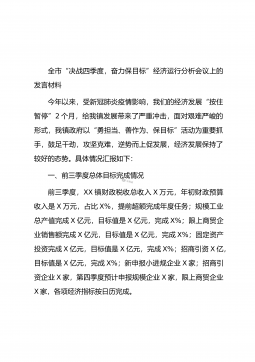 全市“决战四季度,奋力保目标”经济运行分析会议上的发言材料今年以来,受新冠肺炎疫情影响,我们的经济发展“按住暂停”2个月,给我镇发展带来了严重冲击,面对艰难严峻的形式,我镇政府以“勇担当、善作为、保目标”活动为重要抓手,鼓足干劲,攻坚克难,逆势而上促发展,经济发展保持了较好的态势。具体情况汇报如下:一、前三季度总体目标完成情况前三季度,XX镇财政税收总收入X万元,年初财政预算收入是X万元,占比X%,提前超额完成年度任务;规模工业总产值完成X亿元,目标值是X亿元,完成X%;限上商贸企业销售额完成X亿元,目标值是X亿元,完成X%;固定资产投资完成X亿元,目标值是X亿元,完成X%;招商引资X亿,目标...