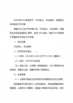 关于开好XXX领导班子“不忘初心、牢记使命”专题民主生活会的工作方案根据公司《关于开好第二批“不忘初心、牢记使命”专题民主生活会的通知》要求,结合XXX实际,制定XXX领导班子专题民主生活会工作方案。一、会议主题不忘初心、牢记使命二、召开民主生活会(一)时间:2019年11月X日下午15:30(星期X)(二)地点:XXXXXX会议室(三)参加人员:公司第一指导组成员,XXX领导班子全体成员。党委办公室、党建科负责人列席会议。三、会前准备(一)认真学习领会习近平新时代中国特色社会主义思想坚持集体学习研讨和个人自学相结合,坚持读原著学原文悟原理,认真学习《纲要》《选编》等规定书目及党史、新中国史,...