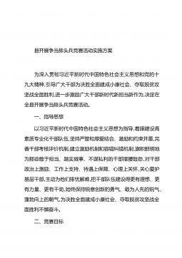 县开展争当排头兵竞赛活动实施方案为深入贯彻习近平新时代中国特色社会主义思想和党的十九大精神,引导广大干部为决胜全面建成小康社会、夺取脱贫攻坚战全面胜利,进一步激励广大干部新时代新担当新作为,决定在全县开展争当排头兵竞赛活动。一、指导思想以习近平新时代中国特色社会主义思想为指导,着眼建设高素质专业化干部队伍,坚持严管和厚爱结合、激励和约束并重,完善干部考核评价机制,建立激励机制和容错纠错机制,旗帜鲜明地为那些敢于担当、踏实做事、不谋私利的干部撑腰鼓劲,对干部政治上激励、工作上支持、待遇上保障、心理上关怀,关心爱护基层干部,主动为他们排忧解难,把干部队伍建设得更有理想、更有力量、更有干劲,始终保持...