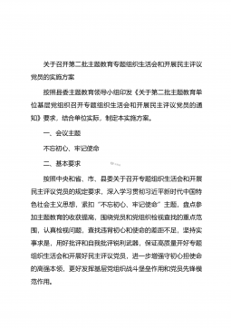 关于召开第二批主题教育专题组织生活会和开展民主评议党员的实施方案按照县委主题教育领导小组印发《关于第二批主题教育单位基层党组织召开专题组织生活会和开展民主评议党员的通知》要求,结合单位实际,制定本实施方案。一、会议主题不忘初心、牢记使命二、基本要求按照中央和省、市、县委关于召开专题组织生活会和开展民主评议党员的规定要求,深入学习贯彻习近平新时代中国特色社会主义思想,紧扣“不忘初心、牢记使命”主题,盘点参加主题教育的收获提高,围绕党员和党组织检视查找的重点范围,认真检视问题,查找违背初心和使命的差距不足,坚持实事求是,用好批评和自我批评锐利武器,保证高质量开好专题组织生活会和开展好民主评议党员,...