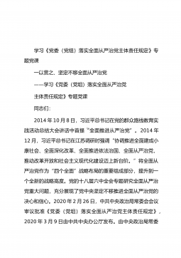 学习《党委(党组)落实全面从严治党主体责任规定》专题党课一以贯之、坚定不移全面从严治党——学习《党委(党组)落实全面从严治党主体责任规定》专题党课同志们:2014年10月8日,习近平总书记在党的群众路线教育实践活动总结大会讲话中首提“全面推进从严治党”。2014年12月,习近平总书记在江苏调研时强调“协调推进全面建成小康社会、全面深化改革、全面推进依法治国、全面从严治党,推动改革开放和社会主义现代化建设迈上新台阶。”将全面从严治党作为“四个全面”战略布局的重要组成部分,提升到一个全新的战略高度。党的十八届六中全会专题研究全面从严治党重大问题,充分展现了党中央坚定不移推进全面从严治党的决心和信心...