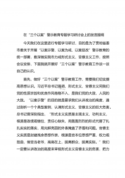在“三个以案”警示教育专题学习研讨会上的发言提纲今天我们在这里进行专题学习研讨,目的是为了贯彻省委市委关于开展“以案示警、以案为戒、以案促改”警示教育的统一部署,推深做实我市力戒形式主义、官僚主义工作,按照会议安排,下面我就开展好“三个以案”警示教育工作谈一谈自己的认识。首先,做好“三个以案”警示教育工作,需要我们切实提高思想认识。习近平总书记强调,形式主义、官僚主义同我们党的性质宗旨和优良作风格格不入,是我们党的大敌,人民的大敌。“以案示警”的目的就是要求我们从讲政治的高度,通过剖析一个个典型案例,认清形式主义、官僚主义的巨大危害。总书记曾深刻指出,“形式主义实质是主观主义、功利主义,根源是...