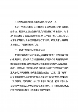 在扶贫整改重点问题观摩推进会上的讲话(县)今天上午由我和XX分别带队到全县东西南北四个片区部分乡镇、村围绕三项扶贫整改重点问题进行了现场观摩。刚才XX同志通报了省暗访反馈情况,XX三个部门做了工作汇报,几位带队领导针对上午观摩情况进行了点评。希望大家认真抓好贯彻落实。下面我再强调几点。一、要进一步提升站位,提高认识要切实提高政治站位,深刻认识做好巩固提升脱贫成效工作的重要意义。虽然我县已经脱贫摘帽,但是我们也要清醒的认识到,实现摘帽退出只是脱贫攻坚征程上的阶段性胜利,各级各部门要统一思想认识,提高政治站位,深刻认识到做好脱贫攻坚工作的重大意义,深刻理解和准确把握脱贫攻坚由“打赢”到“打好”转变...