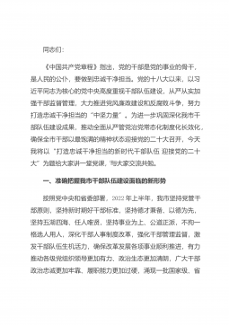 同志们:《中国共产党章程》指出,党的干部是党的事业的骨干,是人民的公仆,要做到忠诚干净担当。党的十八大以来,以习近平同志为核心的党中央高度重视干部队伍建设,从严从实加强干部监督管理,大力推进党风廉政建设和反腐败斗争,努力打造忠诚干净担当的“中坚力量”。为进一步巩固深化我市干部队伍建设成果,推动全面从严管党治党常态化制度化长效化,确保全市干部以最饱满的精神状态迎接党的二十大召开,今天我将以“打造忠诚干净担当的新时代干部队伍迎接党的二十大”为题给大家讲一堂党课,与大家交流共勉。一、准确把握我市干部队伍建设面临的新形势按照党中央和省委部署,2022年上半年,我市坚持党管干部原则,坚持新时期好干部标准...