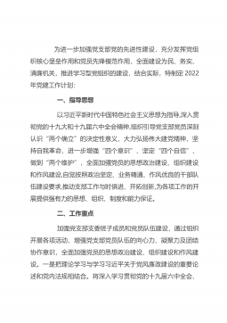 为进一步加强党支部党的先进性建设,充分发挥党组织核心堡垒作用和党员先锋模范作用,全面建设为民、务实、清廉机关,推进学习型党组织的建设,结合实际,特制定2022年党建工作计划: 一、指导思想 以习近平新时代中国特色社会主义思想为指导,深入贯彻党的十九大和十九届六中全会精神,组织引导党支部党员深刻认识“两个确立”的决定性意义,大力弘扬伟大建党精神,坚持自我革命,进一步增强“四个意识”、坚定“四个自信”、做到“两个维护”,全面加强党员的思想政治建设、组织建设和作风建设,自觉按照政治坚定、业务精通、作风优良的干部队伍建设要求,推动支部工作与时俱进、开拓创新,为各...