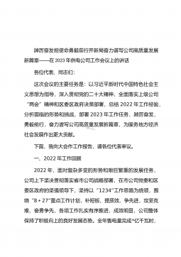 踔厉奋发担使命勇毅前行开新局奋力谱写公司高质量发展新篇章——在2023年供电公司工作会议上的讲话各位代表、同志们:这次会议的主要任务是:以习近平新时代中国特色社会主义思想为指导,深入贯彻党的二十大精神,全面落实上级公司“两会”精神和区委区政府决策部署,总结2022年工作经验,分析面临的形势和挑战,部署2023年工作任务,踔厉奋发,勇毅前行,奋力谱写公司高质量发展新篇章,为服务地方经济社会发展作出更大贡献。下面,我向大会作工作报告,请各位代表审议。一、2022年工作回顾2022年,面对复杂多变的形势和艰巨繁重的发展任务,公司上下坚决贯彻落实省市公司战略部署,在市公司党委和区委区政府的坚强领导下,...