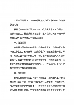 区医疗保障局2023年第一季度落实公平竞争审查工作情况总结汇报根据《**市**区公平竞争审查工作实施方案》工作要求,按照职责分工,结合我局实际工作,现将我局2023年第一季度落实公平竞争审查工作情况总结如下:一、组织领导在我局公平竞争审查领导小组统一领导下,我局公平竞争审查工作扎实、有序开展,对规范性文件和政策措施开展了严格、规范的公平竞争审查工作,将公平竞争理念融入具体经办业务中,将公平审查要求落实到各环节中,有效防止排除、限制竞争的规范性文件及政策措施的出台,为我局的公平竞争审查工作提供了有力的组织保障。二、自查情况我局认真贯彻落实公平竞争审查制度,按照相关工作要求对我局2023年第一季度...