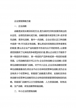 企业营销策略方案一、企业战略战略是实现长期目标的方法,是为谋求生存和发展而做出的长远性、全局性的谋化或方案。战略的基本类型有三种:成本领先战略、差异化战略、集中一点战略。企业必须从这三种战略中选择一种,作为其主导战略。要么把成本控制到比竞争者更低的程度;要么在企业产品和服务中形成与众不同的特色,让顾客感觉到提供了比其他竞争者更多的价值;要么企业致力于服务于某一特定的市场细分、某一特定的产品种类或某一特定的地理范围。公司战略的层次可以分为:企业总体战略(企业战略),经营单位战略和职能部门战略。对于中小企业,企业总体战略和经营单位战略是重合的,即企业不必分总体和经营单位战略,因为企业没有多少个经营...