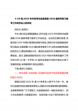在XX县2025年中高考总结复盘暨2026届高考复习备考工作动员会上的讲话同志们,老师们:今天,我们在这里隆重集会,召开全县2025年中高考总结复盘暨2026届高考复习备考工作动员会。会议的主要任务是,系统总结2025年我们取得的成绩与经验,深刻分析当前面临的形势与挑战,全面部署2026届的高考备考工作,动员全县教育战线的同志们,以更加昂扬的斗志、更加扎实的作风,向着新的目标奋勇前进。刚才,县教育局的同志对2025年的中高考质量作了详尽的分析,XX第一中学和XX县综合高级中学的代表也分享了宝贵的经验,讲得都很好,我完全赞同。下面,我讲三点意见。一、肯定成绩,总结经验,在回顾与反思中坚定高质量发...
