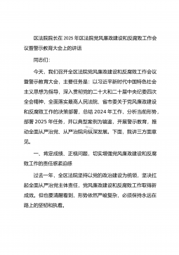 区法院院长在2025年区法院党风廉政建设和反腐败工作会议暨警示教育大会上的讲话同志们:今天,我们召开全区法院党风廉政建设和反腐败工作会议暨警示教育大会,主要任务是:以习近平新时代中国特色社会主义思想为指导,深入贯彻党的二十大和二十届中央纪委四次全会精神,全面落实最高人民法院、省市委关于党风廉政建设和反腐败工作的决策部署,总结2024年工作,分析当前形势,部署2025年任务,并以典型案例为镜鉴,开展警示教育,推动全面从严治党、从严治院向纵深发展。下面,我讲三方面意见。一、肯定成绩、正视问题,切实增强党风廉政建设和反腐败工作的责任感紧迫感过去一年,全区法院坚持以党的政治建设为统领,坚决扛起全面从严...