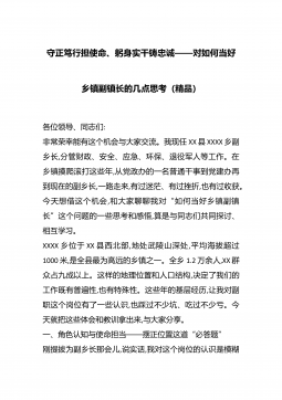 守正笃行担使命、躬身实干铸忠诚——对如何当好乡镇副镇长的几点思考(精品)各位领导、同志们:非常荣幸能有这个机会与大家交流。我现任XX县XXXX乡副乡长,分管财政、安全、应急、环保、退役军人等工作。在乡镇摸爬滚打这些年,从党政办的一名普通干事到党建办再到现在的副乡长,一路走来,有过迷茫、有过挫折,也有过收获。今天想借这个机会,和大家聊聊我对“如何当好乡镇副镇长”这个问题的一些思考和感悟,算是与同志们共同探讨、相互学习。XXXX乡位于XX县西北部,地处武陵山深处,平均海拔超过1000米,是全县最为高远的乡镇之一。全乡1.2万余人,XX群众占九成以上。这样的地理位置和人口结构,决定了我们的工作既有普...