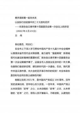 携手谱新篇一起向未来以实际行动迎接中共二十大胜利召开——在政协连云港市第十四届委员会第一次会议上的讲话(2022年2月23日)方 伟各位委员,同志们:在全市上下深入学习贯彻中国共产党十九届六中全会精神认真落实省市党代会决策部署,奋力谱写“强富美高”新港城现代化建设新篇章的重要时刻,政协连云港市第十四届委员会第一次会议隆重开幕了,这是全市人民政治生活中的一件大事,也是我们奋进新征程、建功新时代的一次盛会。在此,我代表中共连云港市委,向大会的召开表示热烈的祝贺!向全体政协委员和与会同志致以诚挚的问候!刚刚过去的2021年,是中国共产党成立100周年。百年党史波澜壮阔,百年初心历久弥坚。一百年来,中...