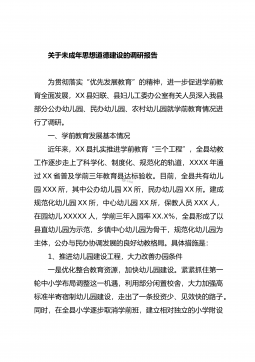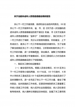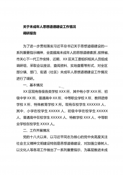 关于未成年人思想道德建设工作情况调研报告为了进一步贯彻落实习近平总书记关于思想道德建设的一系列重要指示精神,全面提高未成年人的思想道德素质,按照省、市关心下一代工作安排,近期,XX区关工委组织相关人员组成调研组,采取会议座谈、查阅资料、实地查看等形式,对全区部分镇、部门、街道(社区)未成年人思想道德建设工作情况进行了调研。一、基本情况XX区现有各级各类学校XXX所,其中有小学XXX所、初级中学XX所、普通高中XX所、中等职业学校X所、教师进修学校X所、特殊教育学校X所。现有在校学生XXXXXX人,其中,小学在校学生XXXXX人,初级中学在校学生XXXXX人,普通高中在校学生XXXXX人、特教学...