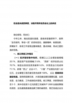在全县决战四季度、决胜开局年动员会议上的讲话各位领导,同志们:今年以来,南站街道在县委、县政府坚强领导下,按照“走在前列、争创一流”的目标定位,提振精神、锐意创新、拼搏实干,各项工作呈现出整体推进、重点突破、亮点凸显的良好态势。一、前三季度工作情况(一)经济指标稳中向好。规模以上工业增加值增幅20.1%,固定资产投资增幅21.6%,“四新”经济投资占比70.7%,制造业技改投资贡献率9.2%,外贸进出口完成率71.1%,新增“四上”企业4个,“十强”产业到位内资1.62亿元,企业攀登工程月度任务完成率100%。(二)招商项目建设快速。坚持把招商引资、大项目建设摆在重要位置,全员攻坚、全力推进,...