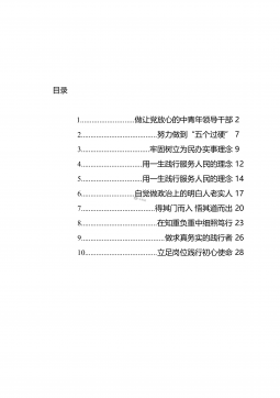 目录1............................做让党放心的中青年领导干部22........................................努力做到“五个过硬”73....................................牢固树立为民办实事理念94................................用一生践行服务人民的理念125................................用一生践行服务人民的理念146............................自觉做政治上的明白人老实人177..................