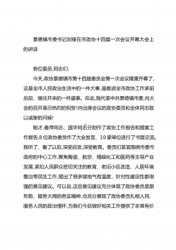 景德镇市委书记刘锋在市政协十四届一次会议开幕大会上的讲话各位委员,同志们:今天,政协景德镇市第十四届委员会第一次会议隆重开幕了,这是全市人民政治生活中的一件大事,是推进全市政协工作承前启后、继往开来的一件盛事。在此,我代表中共景德镇市委,向大会的召开表示热烈的祝贺!向出席会议的政协委员和全体同志致以诚挚的问候!刚才,春萍同志、国华同志分别作了政协工作报告和提案工作报告,8位政协委员作了大会发言、10家单位进行了书面交流。我听了、看了以后,深受启发,深受教育。委员们紧紧围绕市委市政府的中心工作,聚焦陶瓷、航空、精细化工和医药等主导产业发展,紧扣人民群众密切关注的教育、老旧小区改造、人居环境整治等...