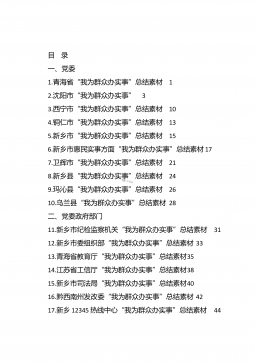 目录一、党委1.青海省“我为群众办实事”总结素材12.沈阳市“我为群众办实事”33.西宁市“我为群众办实事”总结素材104.铜仁市“我为群众办实事”总结素材135.新乡市“我为群众办实事”总结素材156.新乡市惠民实事方面“我为群众办实事”总结素材177.卫辉市“我为群众办实事”总结素材218.新乡县“我为群众办实事”总结素材249.玛沁县“我为群众办实事”总结素材2610.乌兰县“我为群众办实事”总结素材28二、党委政府部门11.新乡市纪检监察机关“我为群众办实事”总结素材3112.新乡市委组织部“我为群众办实事”总结素材3313.青海省教育厅“我为群众办实事”总结素材3514.江苏省工信厅...