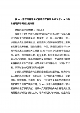 在xxx青年马克思主义者培养工程暨2023年xxx少先队辅导员培训班上的讲话亲爱的辅导员老师们、同志们:大家上午好!为深入学习贯彻习近平总书记关于少年儿童和少先队工作的重要论述,加强党、团、队一体化建设,进一步强化少先队活动课建设,有效提升少先队辅导员的专业素养,推动辅导员专业化、职业化建设。今天,我们在这里举行xxx青年马克思主义者培养工程暨2023年xxx少先队辅导员培训班。首先,我代表团区委、区少工委,向给予培训支持的xxx表示衷心的感谢,向参加培训的全体辅导员,并通过你们向辛勤耕耘在少先队工作第一线的全区少先队辅导员、少先队工作者,表示诚挚的问候和崇高的敬意!少先队辅导员是少先队员的亲...