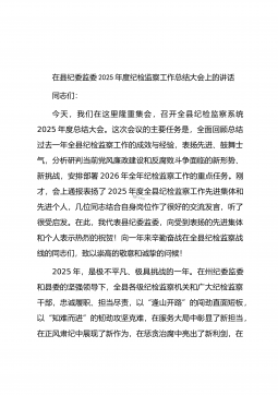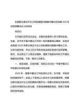 在县群众身边不正之风和腐败问题集中整治总结暨2026年动员部署会议上的讲话同志们:今天我们召开这次会议,主要任务是深入学习贯彻全国、全省、全市关于集中整治工作的一系列重要指示精神,全面总结我县2025年群众身边不正之风和腐败问题集中整治工作,分析当前形势,并对2026年的攻坚决战任务进行动员部署。刚才,会议传达了上级会议精神,通报了我县去年的工作情况,我都完全同意。下面,我讲几点意见。一、肯定成绩,正视问题,深刻认识过去一年集中整治工作的重大阶段性成果2025年,是集中整治工作的深化之年。在市委、市政府的坚强领导下,全县上下坚持以人民为中心的发展思想,将整治群众身边不正之风和腐败问题作为一项重...