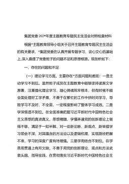 集团党委202*年度主题教育专题民主生活会对照检查材料根据*主题教育领导小组关于召开主题教育专题民主生活会的有关要求,*集团党委在认真开展专题学习、谈心交心的基础上,深入查摆了党委班子的问题不足和思想根源。现剖析如下:一、存在的问题和不足(一)理论学习方面。主要存在*方面问题和差距:一是主动学习不到位。虽然班子成员在主题教育中能够坚持读原文学原著,注重强化理论学习、凝心铸魂筑牢根本,但有时候不能全面处理好工学矛盾,不善于在繁忙的工作中挤时间学习,导致学习不及时、不全面,一定程度影响了整体学习成效。二是学深悟透不到位。在全面准确把握习近平新时代中国特色社会主义思想的真谛真义、思想精髓,学懂弄通党...