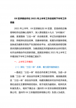 XX区供销合作社2021年上半年工作总结和下半年工作思路2021年上半年,XX区供销社在XX区委、区政府的正确领导和市社的精心指导下,深入贯彻落实十九大“乡村振兴”战略,紧紧围绕“三位一体”农合联改革,牢记为农服务根本宗旨,持续深化综合改革,完善体制机制,拓展为农服务领域,加快成为服务农民生产生活的综合平台,成为党和政府密切联系农民群众的桥梁纽带,为推进我区共同富裕和农业农村现代化作出供销合作社的新贡献。现就区供销社2021年上半年工作情况和下半年工作思路汇报如下:一、上半年工作情况(一)深化“三位一体”改革,着力提升服务能力一是成立“三位一体”综合合作改革工作专班。为进一步加强“三位一体”综...