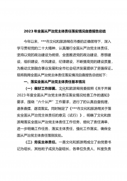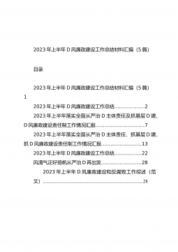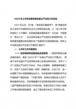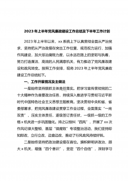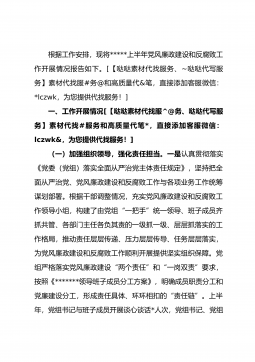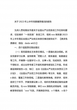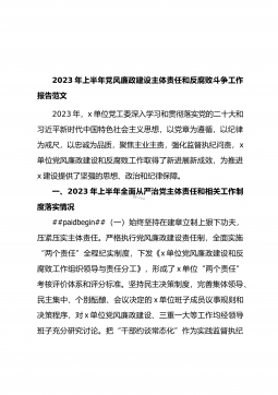 2023年上半年党风廉政建设主体责任和反腐败斗争工作报告范文2023年,x单位党工委深入学习和贯彻落实党的二十大和习近平新时代中国特色社会主义思想,以党章为遵循,以纪律为戒尺,以忠诚为品质,聚焦主业主责,强化监督执纪问责,x单位党风廉政建设和反腐败工作取得了新进展新成效,为推进x建设提供了坚强的思想、政治和纪律保障。一、2023年上半年全面从严治党主体责任和相关工作制度落实情况##paidbegin##(一)始终坚持在建章立制上狠下功夫,压紧压实主体责任。严格执行党风廉政建设责任制,全面实施“两个责任”全程纪实制度,下发《x单位党风廉政建设和反腐败工作组织领导与责任分工》,形成了x单位“两个责...