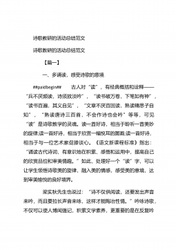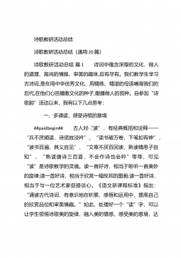 诗歌教研活动总结诗歌教研活动总结(通用20篇)诗歌教研活动总结篇1 诗词中蕴含深厚的文化、做人的道理、高尚的情操、审美的趣味,应有尽有。我们教学生学习古诗词,是在用中华优秀文化、用精练、精湛的母语哺育我们的后代,在他们心田播撒文化的种子,撒播做人的良种。自参加“诗歌韵”活动以来,我有以下几点思考: 一、多诵读,感受诗歌的意境##paidbegin## 古人对“读”,有经典概括和诠释——“兵不厌频读,诗须放淡吟”,“读书破万卷,下笔如有神”,“读书百遍,其义自见”,“文章不厌百回读,熟读精思子自知”,“熟读唐诗三百首,不会作诗也会吟”等等,可见“读”是诗歌教学的灵魂。读一首好诗,相当于聆听...