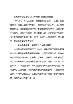 县政府办公室主任2023年述职述德述廉报告今年以来,本人在县委、政府的坚强领导下,在班子成员和单位干部职工的支持帮助下,紧紧围绕中心工作,以主题教育为契机,加强政治理论学习,准确把握角色定位,迅速转变工作角色,狠抓工作落实,坚持勤廉从政,较好完成了各项工作任务和领导交办的任务。现将一年来个人思想建设、履行职责、廉洁自律情况报告如下:一、坚持勤学善思,全面提升个人综合素质始终坚持把学习贯穿于工作始终,努力提高了驾驭全局科学决策水平和应对复杂局面的能力。一是深学系统学。坚持集中学习与自学相结合,读原著、学原文、悟原理,深入系统学习了习近平新时代中国特色社会主义思想、党的二十大和二十届一中、二中全会...