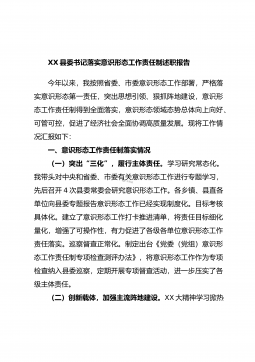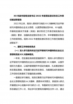 XX市政市容局支部书记2022年度落实意识形态工作责任制述职报告2022年以来,我深入贯彻学习党的XX大精神和习近平新时代中国特色社会主义思想,认真贯彻落实党中央、XX省委、市委和区委关于党委(党组)意识形态工作责任制实施办法(细则)要求,加强和改进意识形态工作,牢牢掌握意识形态工作的领导权。现将2022年度落实意识形态工作责任制情况述职如下:一、履职工作特色和亮点(一)深入学习宣传关涉习近平新时代中国特色社会主义思想和党的XX大精神情况。一年来,在区委区政府的坚强领导下,我深入学习贯彻习近平新时代中国特色社会主义思想和党的XX大精神,以提升组织力为重点,以城市管理提升年活动为载体,扎实推进意...