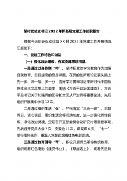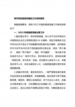某经济发展党支部书记2022年度抓基层党建工作述职报告今年以来,在区委的正确领导下,本人坚持以习近平新时代中国特色社会主义思想为指导,坚持党建引领服务,充分发挥支部的战斗堡垒和党员的先锋模范作用,扎实推进党建与业务深度融合,不断提升社会经济、财政服务、发展改革、农业农村、行政审批、政务服务工作效率和发展质量。现就2022年度抓基层党建工作述职如下:一、工作成效(一)强化组织保障,促进整改提升。作为支部书记,本人积极强化组织保障,把组织活力转化为发展动力,促进整改提升。一是本人坚持以基层党建“五基三化”攻坚年行动为抓手,通过强化政治保障和组织保障、规范组织生活和组织制度、加强业务培训和改善必备条...