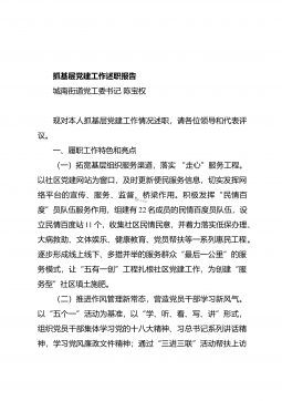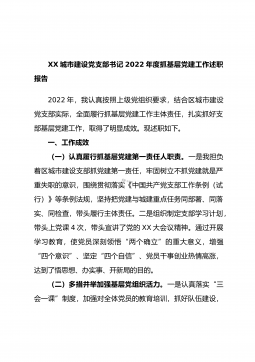 XX城市建设党支部书记2022年度抓基层党建工作述职报告2022年,我认真按照上级党组织要求,结合区城市建设党支部实际,全面履行抓基层党建工作主体责任,扎实抓好支部基层党建工作,取得了明显成效。现述职如下。一、工作成效(一)认真履行抓基层党建第一责任人职责。一是我担负着区城市建设支部抓党建第一责任,牢固树立不抓党建就是严重失职的意识,围绕贯彻落实《中国共产党支部工作条例(试行)》等条例法规,坚持把党建与城建重点任务同部署、同落实、同检查,带头履行主体责任。二是组织制定支部学习计划,带头上党课4次,带头宣讲了党的XX大会议精神。通过开展学习教育,使党员深刻领悟“两个确立”的重大意义,增强“四个意...