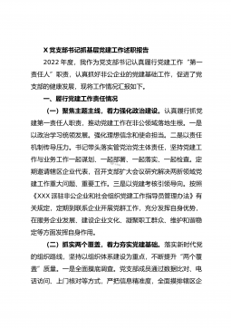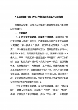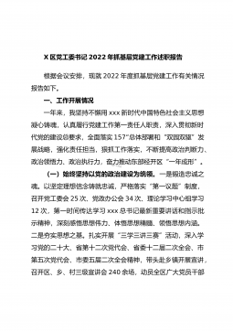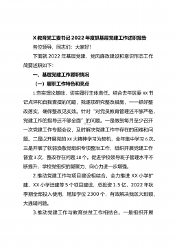 X教育党工委书记2022年度抓基层党建工作述职报告各位领导、同志们:大家好!下面就2022年基层党建、党风廉政建设和意识形态工作简要述职如下:一、基层党建工作履职情况(一)履职工作特色和亮点1.夯实理论基础,切实履行主体责任。结合去年区委XX书记点评和自我查摆的问题,我逐项研究整改措施,一一抓好整改落实,确保整改见实效。针对“对党员教育管理还不够严格,党建工作的指导还不够全面”的问题。一是做到每月至少召开一次党建工作专题会议,及时解决党建工作中存在的困难和问题。二是以开展党的XX大精神学习为契机,全年集中学习6次。三是开展了软弱涣散党组织专项整治工作,组织开展党建工作督查3次,整改存在问题28...