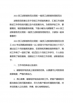 2022员工述职报告范文简短一般员工述职报告简短范文述职的目的意义在于总结工作经验和教训,汇报工作成绩陈述工作存在的问题以及今后发展方向。为领导评估工作,掌握情况,制定措施提供依据。下面小编为大家整理了2022员工述职报告范文简短一般员工述职报告简短范文,大家快一起来看看吧!2022员工述职报告范文简短一般员工述职报告简短范文员工2022年试用期述职报告一从入职至今不知不觉已快三个月了,通过这三个月的锻炼和磨合,在领导和同事的指导帮助下,我对工作有了一定的了解,经过这三个月的工作学习,个人综合素质有了新的提高,回顾这三个月来的工作历程,述职报告如下:一、工作中的体会以及成长:1、能够较好地完成...