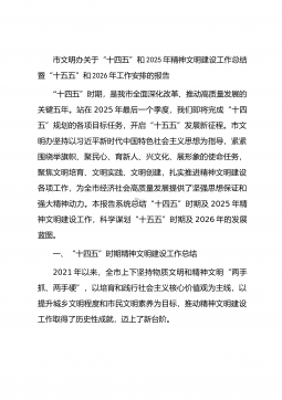 市文明办关于“十四五”和2025年精神文明建设工作总结暨“十五五”和2026年工作安排的报告“十四五”时期,是我市全面深化改革、推动高质量发展的关键五年。站在2025年最后一个季度,我们即将完成“十四五”规划的各项目标任务,开启“十五五”发展新征程。市文明办坚持以习近平新时代中国特色社会主义思想为指导,紧紧围绕举旗帜、聚民心、育新人、兴文化、展形象的使命任务,聚焦文明培育、文明实践、文明创建,扎实推进精神文明建设各项工作,为全市经济社会高质量发展提供了坚强思想保证和强大精神动力。本报告系统总结“十四五”时期及2025年精神文明建设工作,科学谋划“十五五”时期及2026年的发展蓝图。一、“十四五...