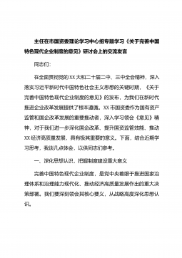 主任在市国资委理论学习中心组专题学习《关于完善中国特色现代企业制度的意见》研讨会上的交流发言同志们:在全面贯彻党的XX大和二十届二中、三中全会精神,深入落实习近平新时代中国特色社会主义思想的关键时期,《关于完善中国特色现代企业制度的意见》的发布,为我们在新时代推进企业改革发展提供了根本遵循。XX市国资委作为国有资产监管和国企改革发展的重要推动者,深入学习领会《意见》精神,对于我们进一步深化国企改革、提升国资监管效能、推动XX经济高质量发展,具有极其重要的意义。下面,结合近期学习思考,我谈几点体会,以供同志们参考。一、深化思想认识,把握制度建设重大意义完善中国特色现代企业制度,是党中央着眼于推进...