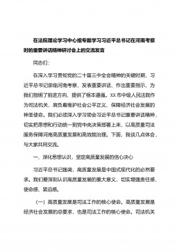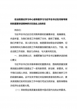在法院理论学习中心组专题学习习近平总书记在河南考察时的重要讲话精神研讨交流会上的讲话同志们:习近平总书记近日在河南考察时的重要讲话,高屋建瓴、内涵丰富,为我们各项工作指明了方向、提供了遵循。今天,我们齐聚于此,深入研讨交流,就是要深刻领会讲话精神,切实将其转化为推动法院工作高质量发展的强大动力。下面,结合法院工作实际,我谈几点体会,与大家共同交流。一、深化思想认识,准确把握习近平总书记重要讲话的核心要义习近平总书记在河南考察时的重要讲话,围绕高质量发展高效能治理等方面提出了一系列新思想、新论断、新要求。对于我们法院人来说,深刻理解这些核心要义,是我们做好工作的前提和基础。这不仅关乎我们对自身职...