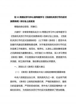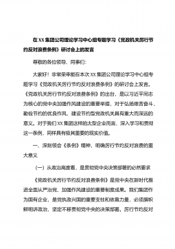 在XX集团公司理论学习中心组专题学习《党政机关厉行节约反对浪费条例》研讨会上的发言尊敬的各位领导、同事们:大家好!非常荣幸能在本次XX集团公司理论学习中心组专题学习《党政机关厉行节约反对浪费条例》的研讨会上发言。《党政机关厉行节约反对浪费条例》的出台,是以习近平同志为核心的党中央加强作风建设的重要举措,对于弘扬艰苦奋斗、勤俭节约的优良作风,建设节约型党政机关具有重大而深远的意义。对于我们XX集团这样的大型企业而言,深入学习和贯彻这一条例,同样具有极其重要的现实价值。一、深刻领会《条例》精神,明确厉行节约反对浪费的重大意义(一)从政治高度看,是贯彻党中央决策部署的必然要求《党政机关厉行节约反对浪...